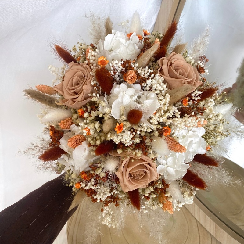 - Composition : Rose, gypsophile, broom bloom, eucalyptus, lagurus, pampas, phalaris.