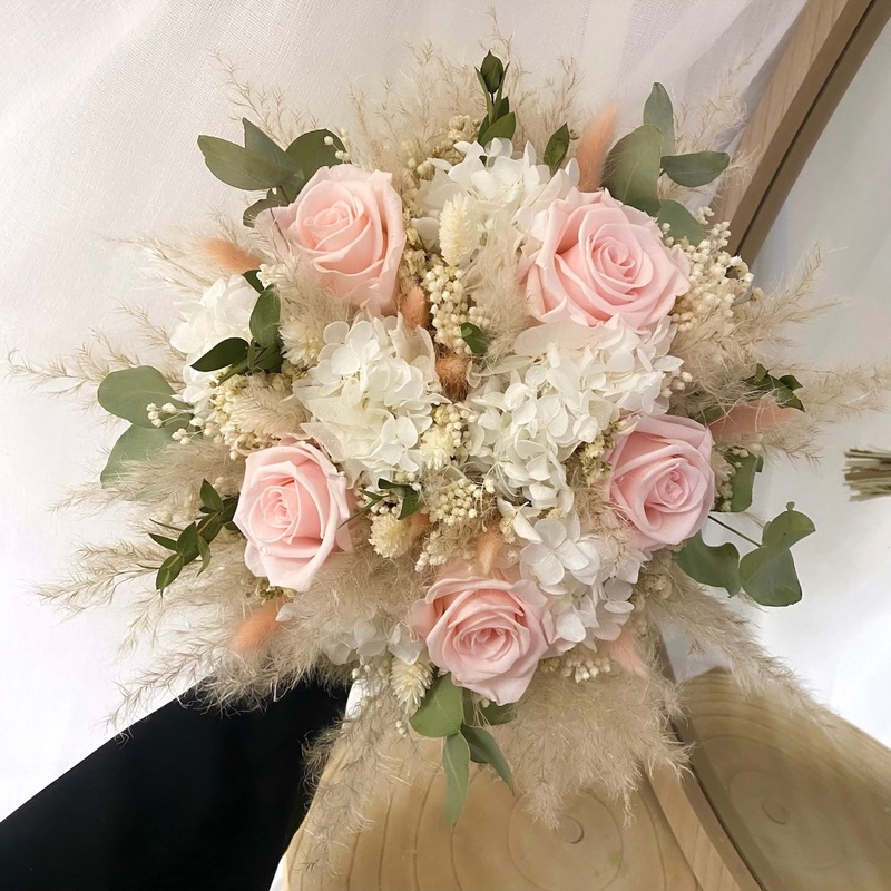 - Composition : Hortensia, lagurus, phalaris, broom bloom, pampas, eucalyptus.