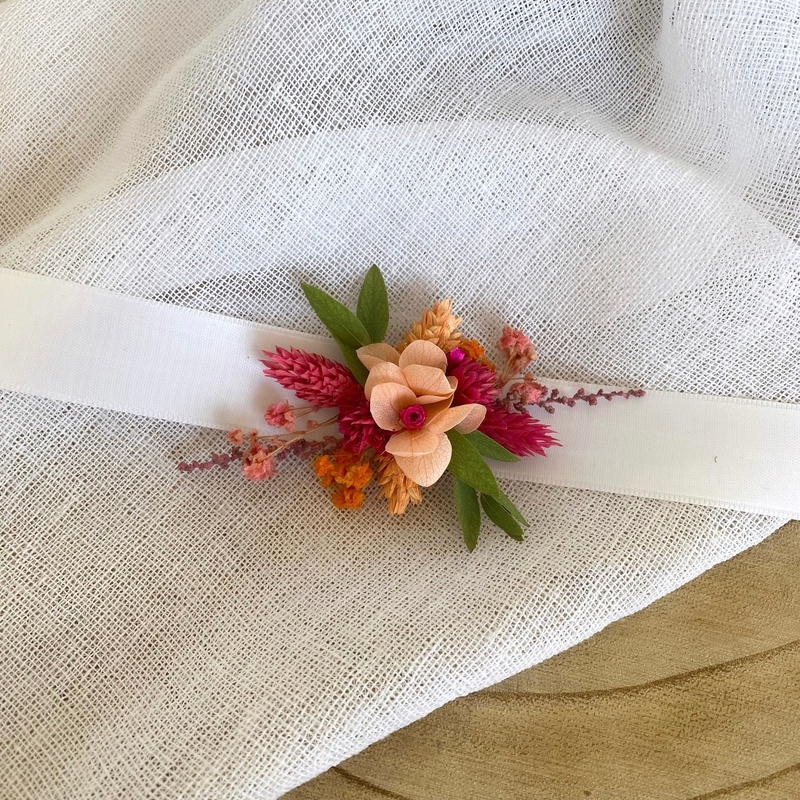 La boutonnière est composée avec des fleurs et feuillages stabilisés & séchés. Parfaite pour apporter une touche fleurie et élégante à la tenue.