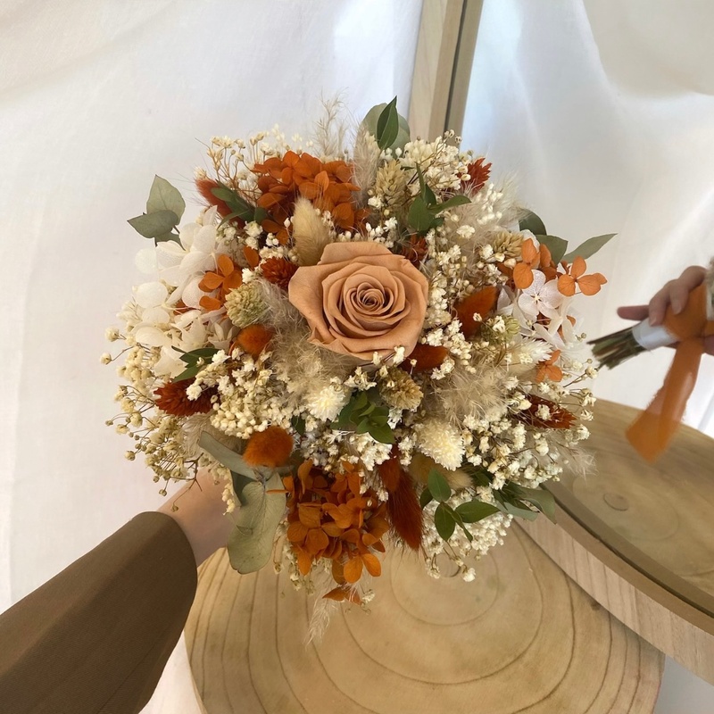 - Composition : Rose, gypsophile, broom bloom, eucalyptus, lagurus, pampas, phalaris.