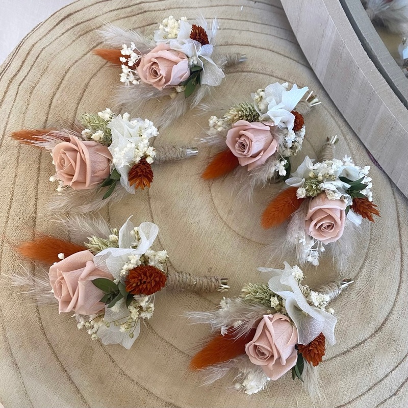 Chaque boutonnière est réalisée à la main avec de véritables fleurs stabilisées et séchées, donc de légères différences avec la photo peuvent exister (forme, couleurs).
