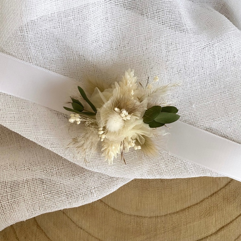 Le bracelet est composé avec des fleurs et feuillages stabilisés & séchés.