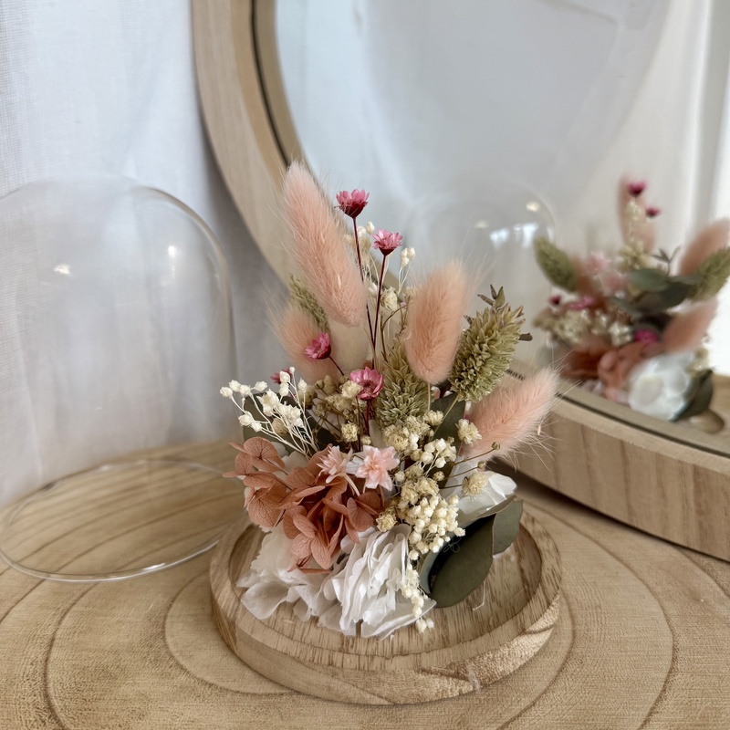 Apportez une touche de douceur et de poésie à votre intérieur avec cette cloche fleurie aux nuances de rose poudré et de vert. Composée de fleurs et feuillages stabilisés & séchés, chaque création est assemblée à la main avec soin pour offrir une décoration élégante, naturelle et durable, sans entretien.