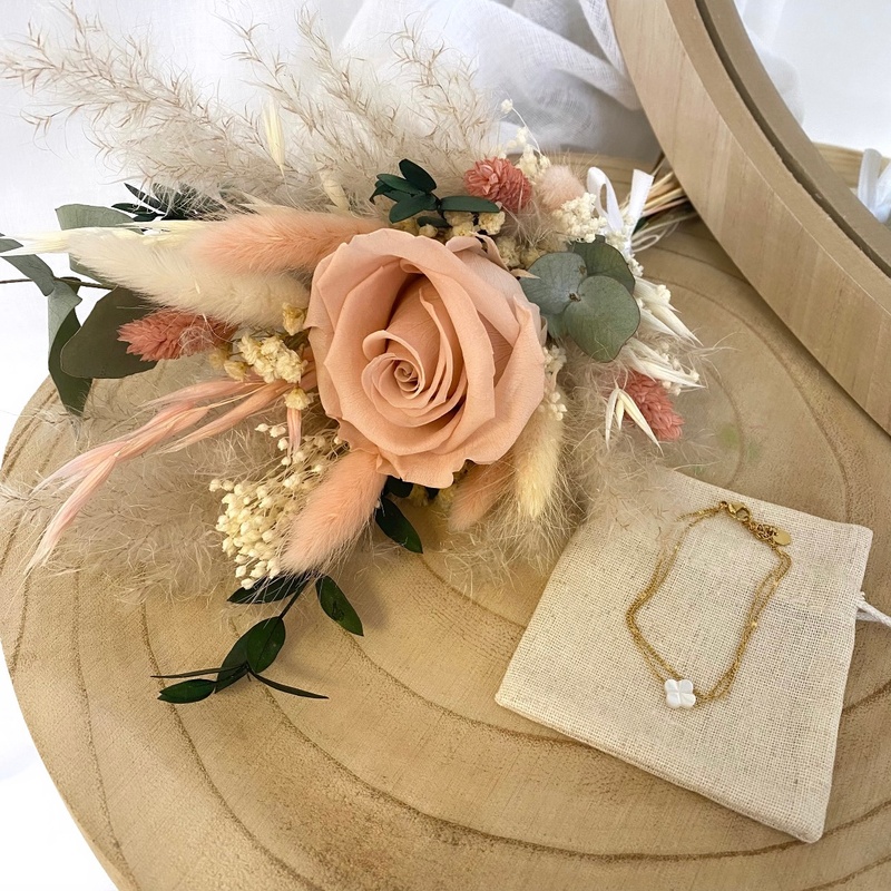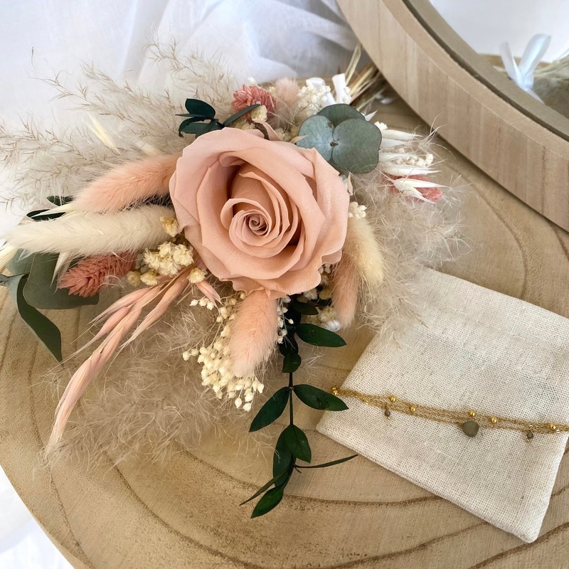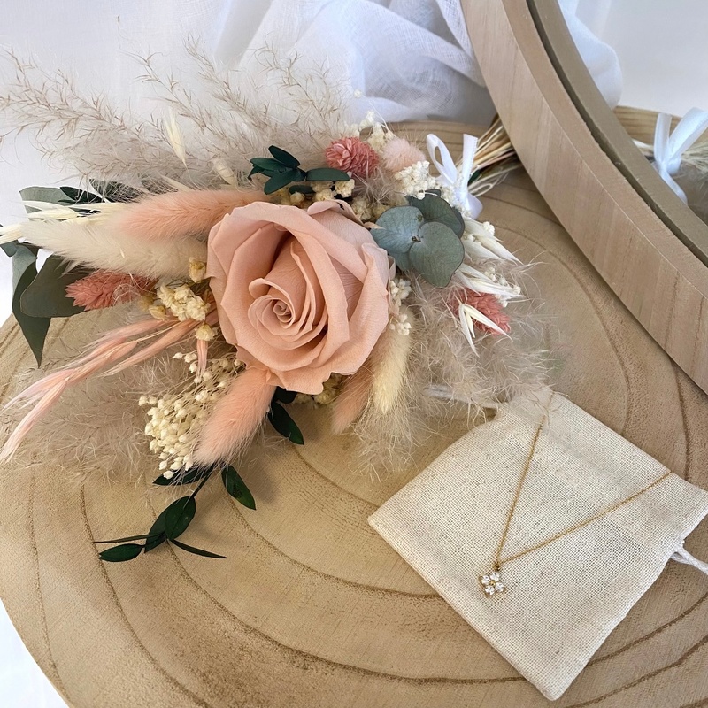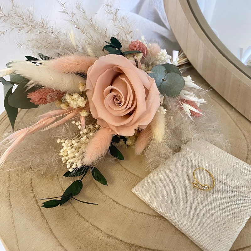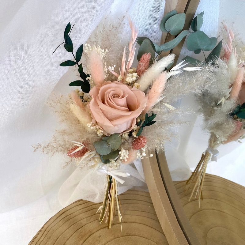- Composition du bouquet : Rose, eucalyptus, pampas, broom bloom, lagurus.
