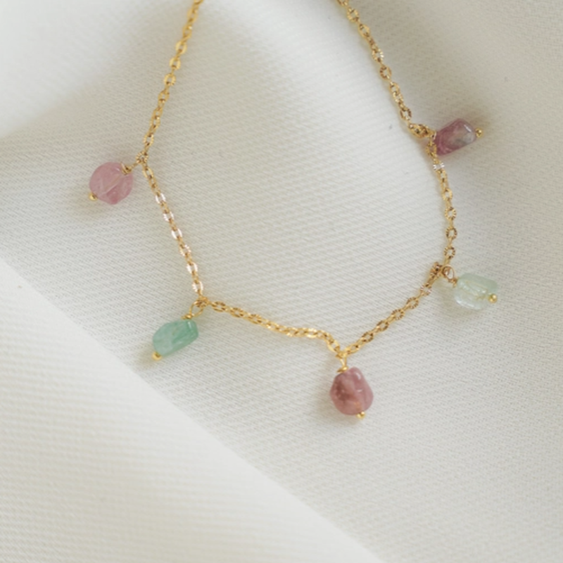 - Détails du bracelet vert/rose : Pierre fine : Tourmaline, longueur du bracelet : 15,5cm + 3cm de chainette de réglage.