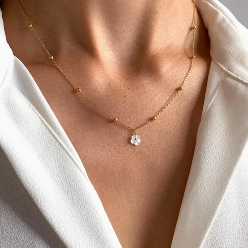 - Détails du collier fleur blanche : Pendentif : nacre blanche, chaine de 39 cm + 5 cm de chainette de réglable.
