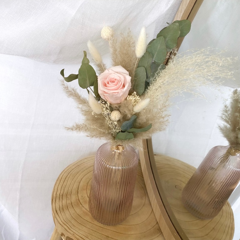 Chaque création est réalisée à la main avec de véritables fleurs stabilisées et séchées, donc de légères différences avec la photo peuvent exister. La taille (hauteur, diamètre) est approximative, elle peut varier de quelques cm selon le bouquet car chaque fleur est unique. Les couleurs peuvent être légèrement différentes selon les arrivages de nos fleurs.