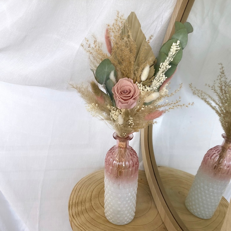 Chaque création est réalisée à la main avec de véritables fleurs stabilisées et séchées, donc de légères différences avec la photo peuvent exister. La taille (hauteur, diamètre) est approximative, elle peut varier de quelques cm selon le bouquet car chaque fleur est unique. Les couleurs peuvent être légèrement différentes selon les arrivages de nos fleurs.