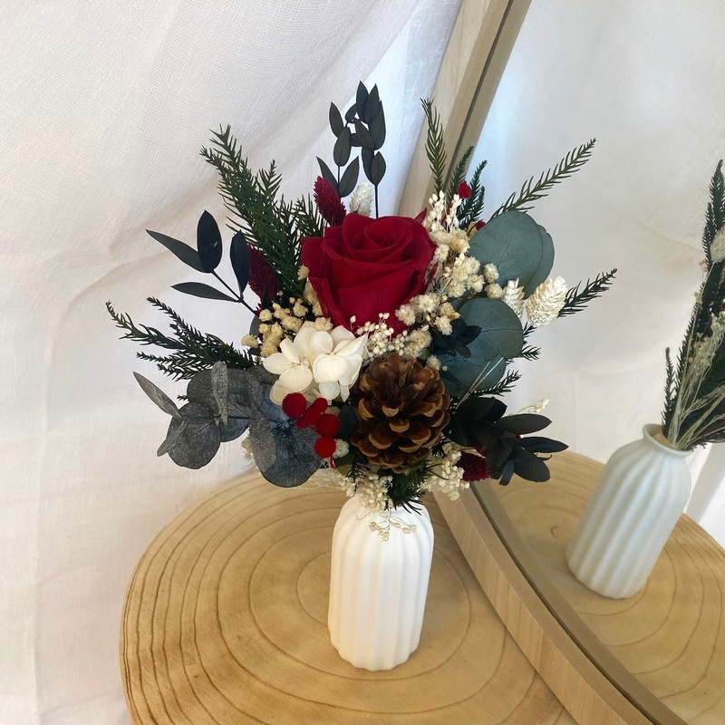 La composition est composée avec des fleurs et feuillages stabilisés & séchées. Création naturelle et durable qui habillera parfaitement votre table de Noël, ou pour le plaisir d’offrir.