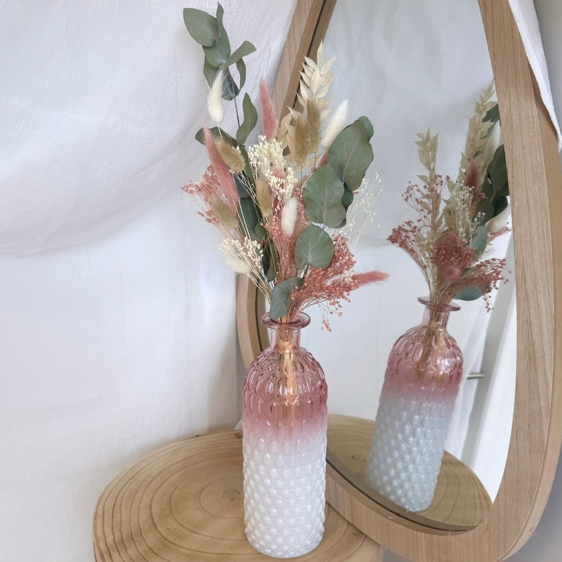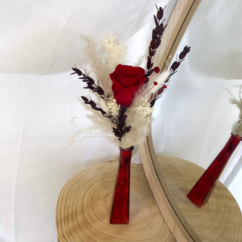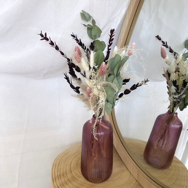 Chaque création est réalisée à la main avec de véritables fleurs stabilisées et séchées, donc de légères différences avec la photo peuvent exister. La taille (hauteur, diamètre) est approximative, elle peut varier de quelques cm selon le bouquet car chaque fleur est unique. Les couleurs peuvent être légèrement différentes selon les arrivages de nos fleurs.