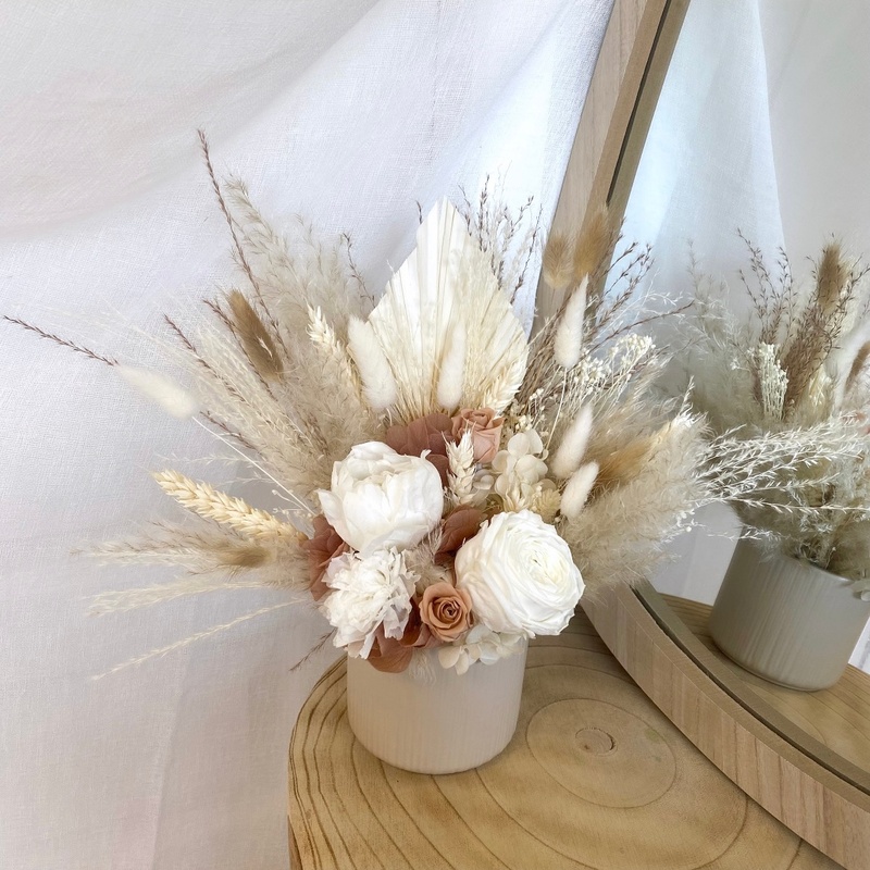 Chaque création est réalisée à la main avec de véritables fleurs stabilisées et séchées, donc de légères différences avec la photo peuvent exister. La taille (hauteur, diamètre) est approximative, elle peut varier de quelques cm selon le bouquet car chaque fleur est unique. Les couleurs peuvent être légèrement différentes selon les arrivages de nos fleurs.