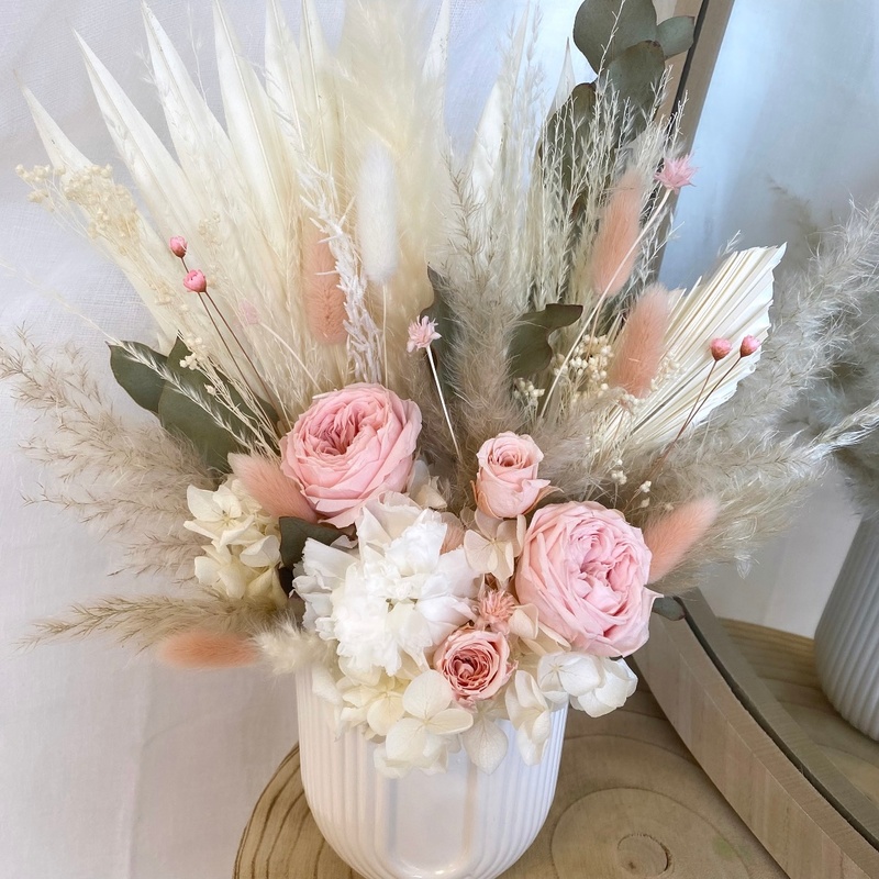 - Composition : Palme, rose, rose anglaise, hortensia, eucalyptus, pampas, oeillet, miscanthus, lagurus, phalaris, glixia, hill flowers.