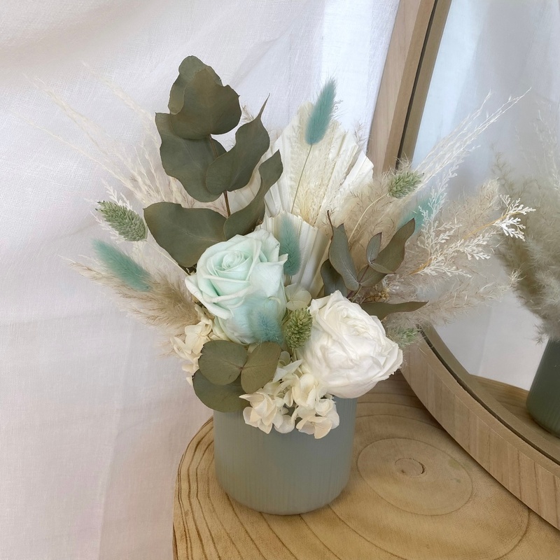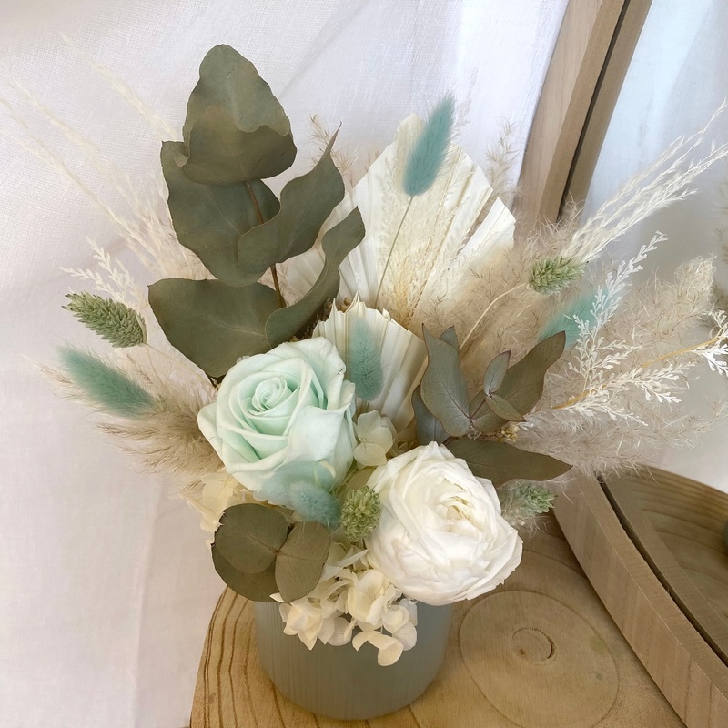 Chaque création est réalisée à la main avec de véritables fleurs stabilisées et séchées, donc de légères différences avec la photo peuvent exister. La taille (hauteur, diamètre) est approximative, elle peut varier de quelques cm selon le bouquet car chaque fleur est unique. Les couleurs peuvent être légèrement différentes selon les arrivages de nos fleurs.