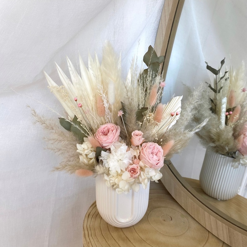 La composition est composée avec des fleurs et feuillages stabilisés & séchées. Création naturelle et durable qui habillera parfaitement votre petit cocon, ou pour le plaisir d’offrir.