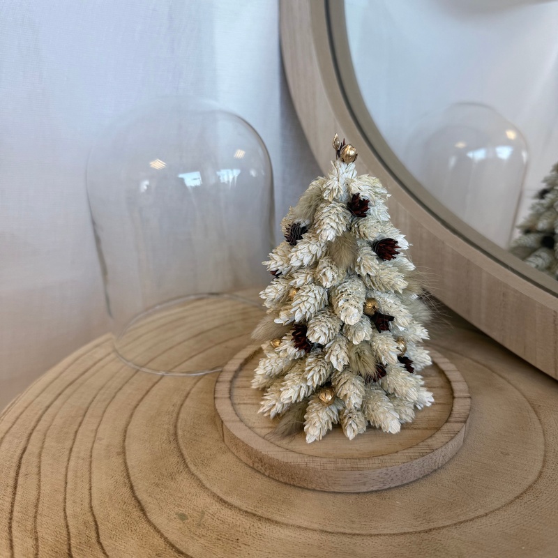 Apportez une touche chaleureuse à votre intérieur avec cette cloche décorative en forme de sapin, aux tons blanc et rouge. Composée de fleurs et de feuillages stabilisés et séchés, chaque pièce est soigneusement assemblée à la main pour offrir une création unique, durable et sans entretien.
