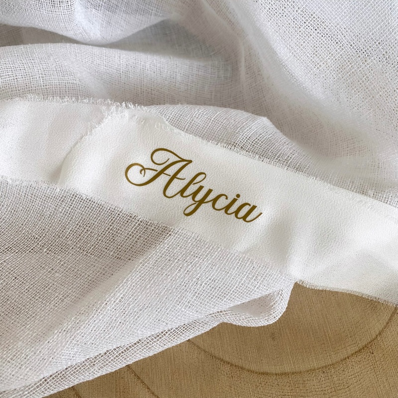 La personnalisation est réalisée sur le ruban en mousseline. La taille de l’écriture peut légèrement varier selon la longueur du texte. Pas de bon à tirer. Ecriture dorée.