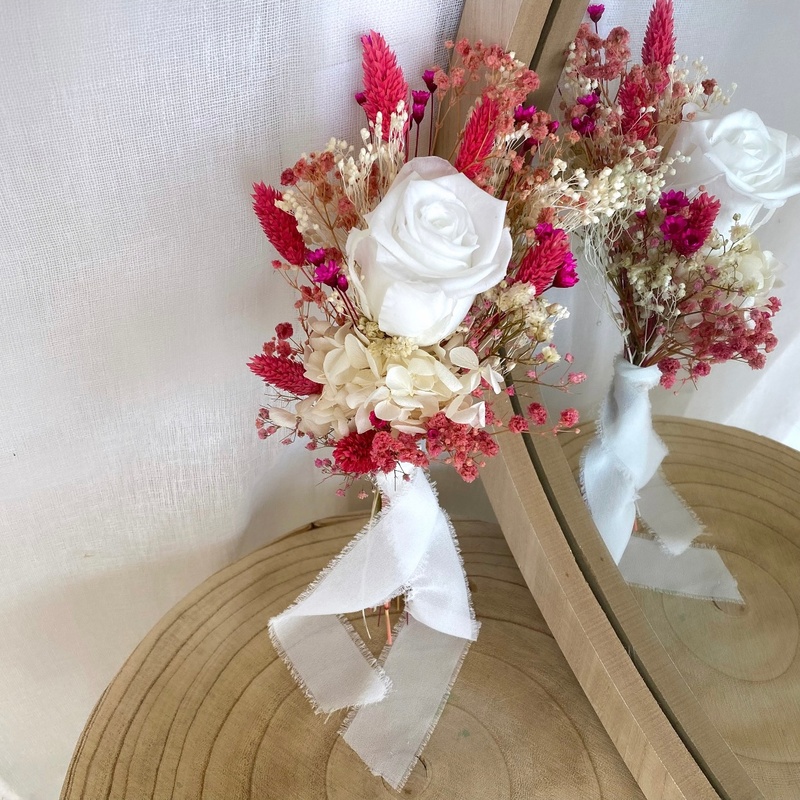Le bouquet de demoiselle est composé avec des fleurs et feuillages stabilisés & séchés.