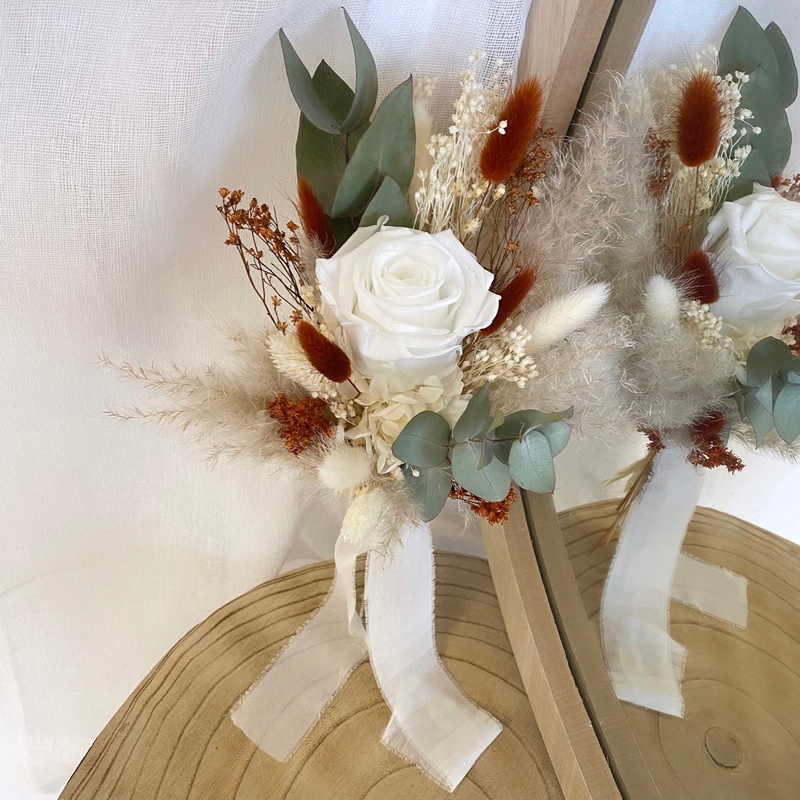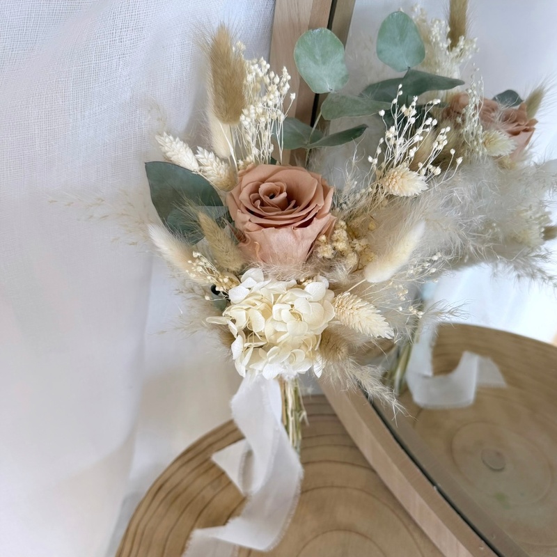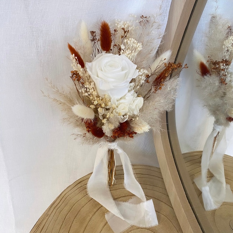 Le bouquet de demoiselle est composé avec des fleurs et feuillages stabilisés & séchés.