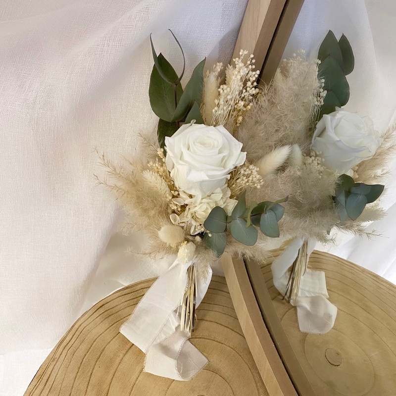 Le bouquet de demoiselle est composé avec des fleurs et feuillages stabilisés & séchés.
