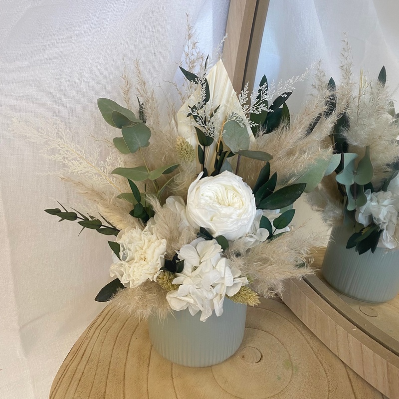 Chaque bouquet est réalisé à la main avec de véritables fleurs stabilisées et séchées, donc de légères différences avec la photo peuvent exister. La taille (hauteur, diamètre) est approximative, elle peut varier de quelques cm selon le bouquet car chaque fleur est unique. Les couleurs peuvent être légèrement différentes selon les arrivages de nos fleurs.
