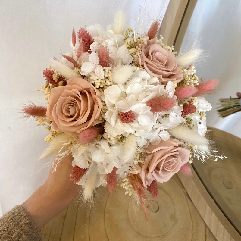 Votre bouquet de mariée en fleurs stabilisées et séchées peut tenir facilement une journée au soleil.